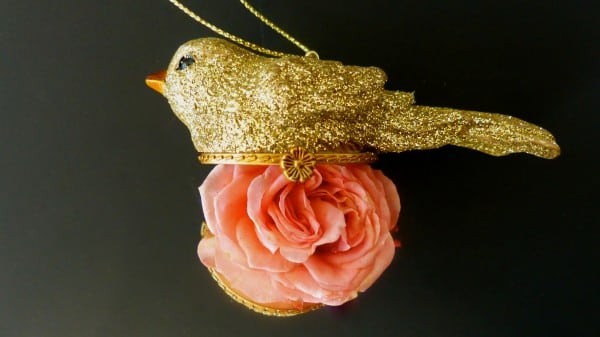 A chubby bird hovers mid-air, a shimmery gold confection that catches the sunlight with its feathers. Into its bosom, I tucked a pale pink rose from my backyard garden—a secret treasure of the sort that I suspect Nana and Maymer loved best. Over time the petals will fade and crumble, but as with our most cherished memories, their essence will remain.