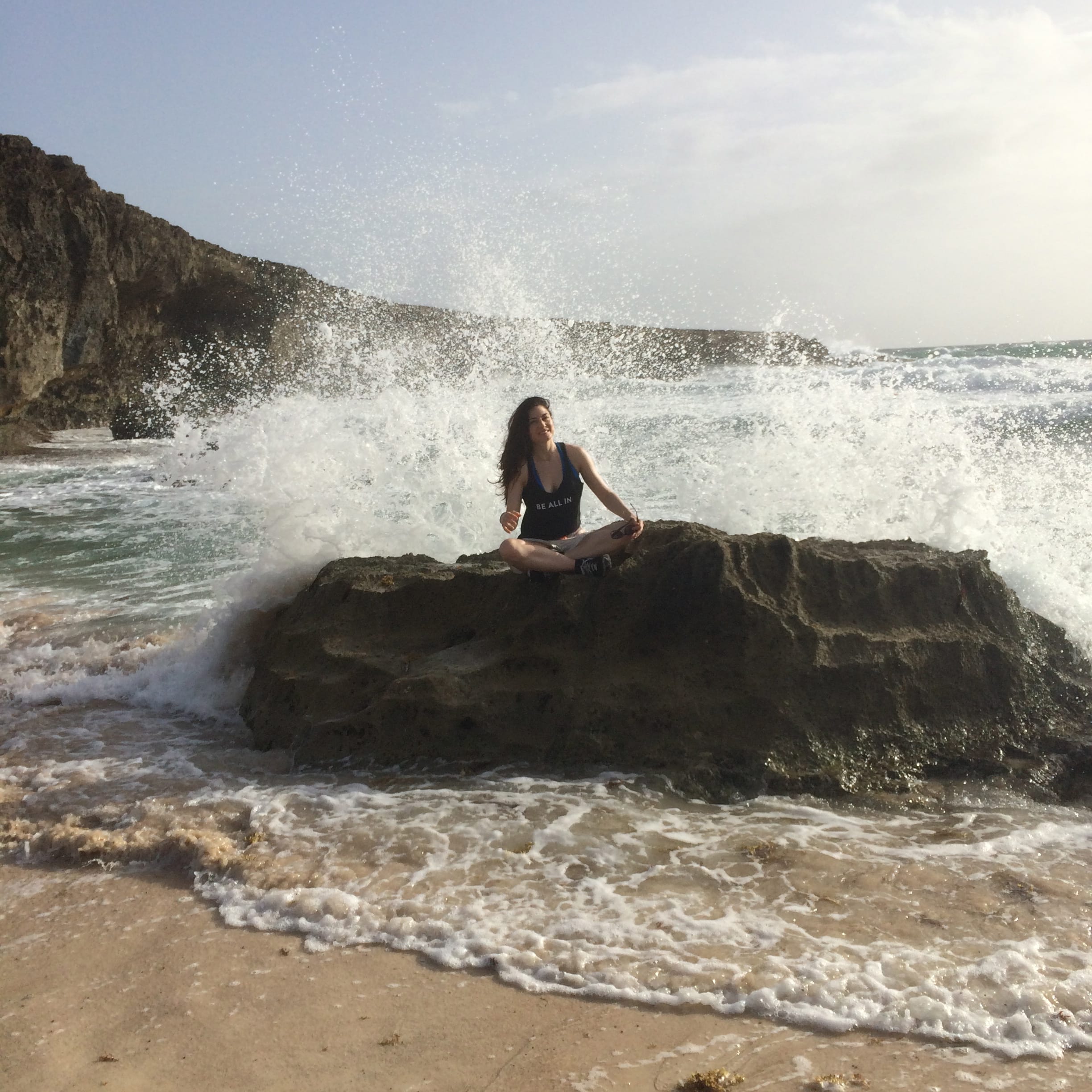 We continued to walk until we reached the coastline. I climbed up on the rocks and tried to do a yoga pose but it was slippery and I was scared so I stood there with my arms in the air as my friend Yulady took a picture. I was wearing a tank top that said Be All In and was I ever. My feet were aching, my skin was filthy, I was soaked from a wave that had crashed on the rocks, but my god, was I all in, knee-deep in, waist-high in, up to my neck in, I was in, and I would keep going in, deeper.