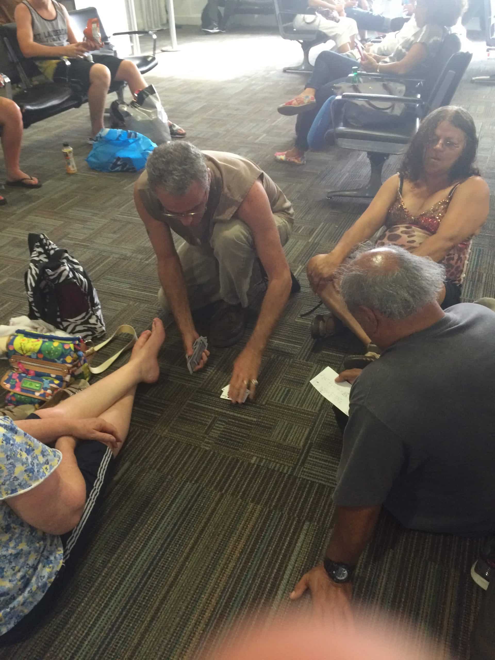 Two hours later, I make it though all the lines and my bra strap breaks again. I get in line at the Happy Bar and order a white wine, which he gives me in a mini bottle with a Dixie cup of ice. I take it to the gate. Thank you, Happy Island, for allowing me to walk through the airport with a plastic cup of wine. In the States, we can do no such thing.
