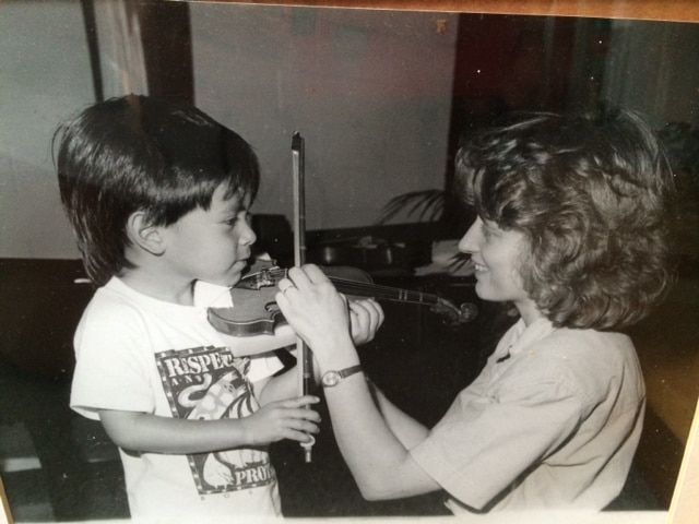 Here is where it began, where the music became a thing for me, the parent, rather than an idea for me, the dreamer. I watched as the child set his chin upon a tiny wooden table and then arched his back, relaxed his wrist, wrapped his fist, barely the size of a golf ball, around the gargoyle’s limb, his twiggy fingers grasping, curled, then padding down like the paws of a six week old kitten. His other fist was gnarled about the end of a magic wand. The child wasn’t much older than a kitten himself, and the gargoyle, too, was a baby, only a fraction of the size of its progenitor. No, not a gargoyle, but a violin. And the wand, diminutive as well. The teacher kneeling down before him prepared to reassemble any erring part. She resembled one of the archangels. It was more in the delicacy of her features, the indelible sweetness of her smile, the look in her eyes an amalgam of humor, determination, compassion; it was the nurturing that spun out of those eyes that were entirely focused on the child. The teacher, Thalia Greenhalgh. She would birth music in both my children. Her teacher was Louise Behrend, who would one day teach Eliza, my girl. This child was David. He was four years old.