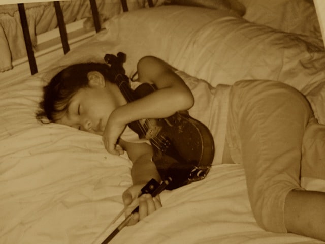 So, it happened that I gave David this choice when he was four years old, between piano and violin, and he chose the violin, and I found a violin teacher. I saw advertised on one of those roadside church signs: “Suzuki Violin.” That was twenty-five years ago, six teachers ago, probably as many violins ago, and now he is his own teacher, a musician—improvising music, who himself is a teacher. Eliza, too, fifteen years of music, now that she is seventeen, off to college for music. Six teachers, and nine violins. The violins growing with the child.