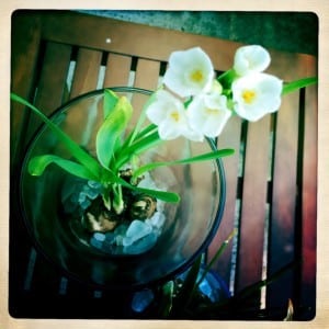 Further research reveals that they are anything but hearty. Paperwhites can’t tolerate freezing temperatures and won’t survive a cold winter outdoors. The good news, I discover is that they are easy to grow indoors and don’t even require soil. Rocks and water is all that they need to get them started. My husband calls the local nursery. They have twelve bulbs left.
