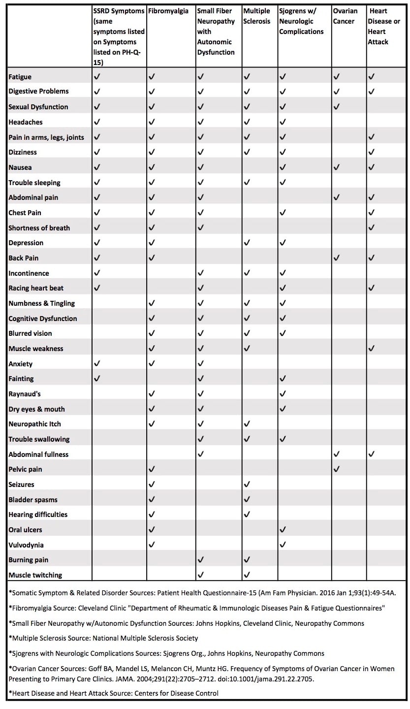At numerous doctor’s appointments, I was given the Patient Health Questionnaire – 15 (PHQ-15), a tool frequently used to diagnose fibromyalgia, SSRD and multiple mental illnesses, which has symptoms that are also associated with diseases that primarily affect women. The tool listed 15 symptoms and a rating scale of how severely these symptoms affected your life. Each time I checked off most if not all of the symptoms listed, including chest pain, fatigue, heart pounding, nausea, pain, shortness of breath, and stomach pain (refer to chart for complete list). In filling out the PHQ-15, I thought I was helping the doctor get closer to a diagnosis and treatment. Instead, I was checking off a list of “somatic symptoms” that pointed them away from a physical illness and toward a psychiatric disorder like SSRD. Small fiber neuropathy, autoimmune disease, ovarian cancer, autonomic dysfunction, heart disease, Myalgic Encephalomyelitis/Chronic Fatigue Syndrome, Ehlers-Danlos syndromes, and now long-term Covid 19, conditions that affect millions of women, all have symptoms listed on the PHQ-15, and on screening questions for fibromyalgia. Another devastating problem with this set up is that more and more women are afraid of speaking up about their mental health symptoms, like I was, for fear of their physical symptoms being overlooked, or labelled as psychosomatic.